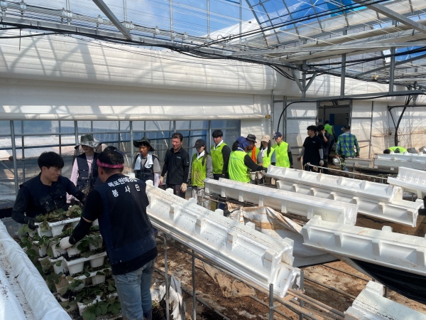 이 날 참여자들은 피해시설(4동, 1000평) 내 침수된 딸기 육묘와 배지를 수거하고 파손된 급수시설 등을 철거하는 작업을 실시했다.