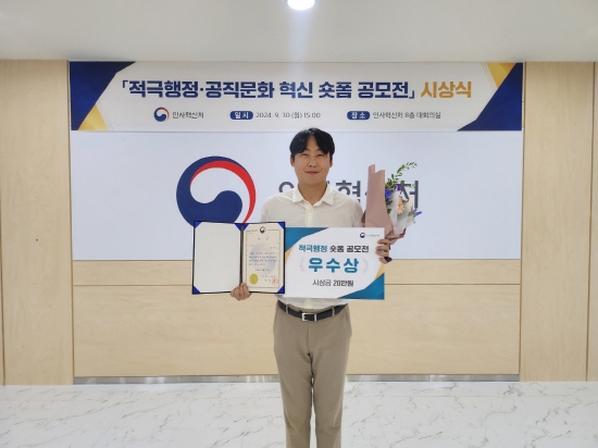 (전남=NSP통신) 김성철 기자 = 여수광양항만공사(사장 박성현, YGPA)는 지난 달 30일 인사혁신처에서 주관한 '2024년 적극행정ㆍ공직문화혁신 숏폼 공모전‘에서 ‘중앙동 소형선 부두 IoT 주차 차단기 설치(제안자:여수지사 최정오)’가 적극행정 부문 우수상을 수상했다고 밝혔다. 숏폼는 30초에서 1분미만의 짧은 영상이다.