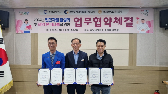 광양읍은 복지 사각지대에 놓인 취약계층의 일상 회복과 지역사회에 온기 나눔 문화확산을 목적으로 광양중앙로타리클럽과의 협력을 강화하기 위해 업무협약을 체결했다.