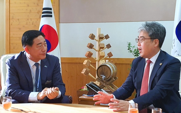 김한종 장성군수(사진 왼쪽)가 지난 21일 임상섭 산림청장과 면담을 갖고 국립아열대자생식물원 유치에 대한 협조를 요청하고 있다. (사진 = 장성군)