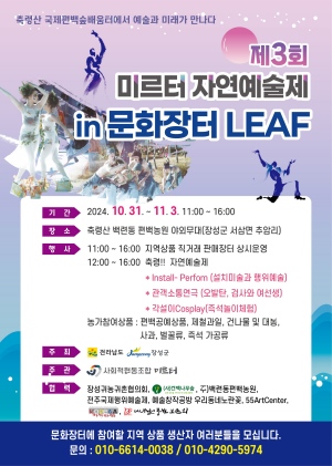 오는 31일부터 11월 3일까지 서삼면 국제편백숲배움터 하모니센터에서 ‘제3회 미르터 자연예술제’가 개최되는 것.