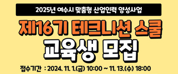 (전남=NSP통신) 서순곤 기자 = 여수시가 여수국가산단 대기업 취업의 등용문으로 통하는 ‘테크니션 스쿨’ 16기 교육생 40명을 오는 13일까지 모집한다.