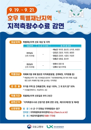 국토교통부 이번 지적측량 수수료 감면을 통해 호우 피해 주민들의 경제적 부담을 경감하고 신속한 피해복구를 돕기로 했다.