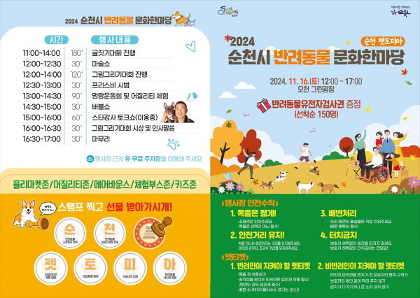 (전남=NSP통신) 남정민 기자 = 전남 순천시(시장 노관규)는 오는 16일 12시부터 오천그린광장에서 반려동물과 반려인, 비반려인이 함께하는 ‘2024 반려동물 문화한마당’ 행사를 개최한다고 밝혔다.