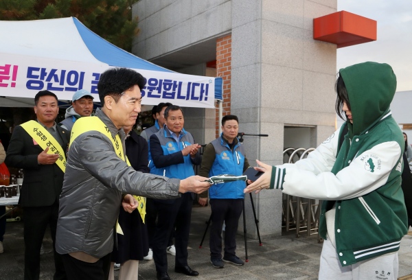 이와 함께 박수진 나주학부모연합회장을 비롯한 학부모, 학생들과 지역 봉사단체인 나주빛가람‧나주이화 로타리클럽 회원 20여 명도 아침 일찍 시험장을 찾아 수험생들에게 핫팩과 따뜻한 차를 전하며 응원했다.