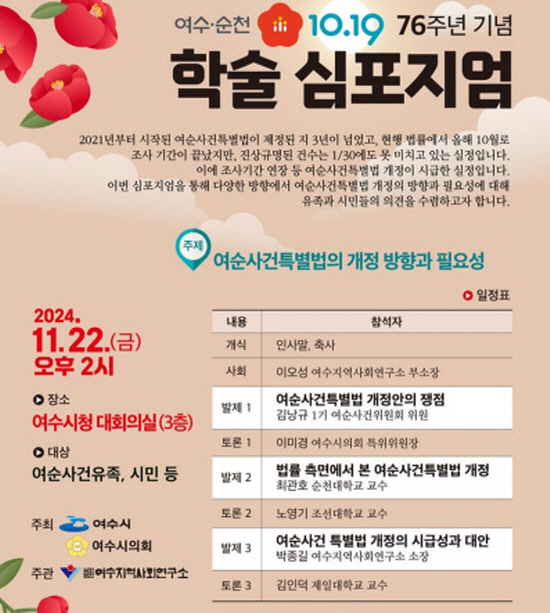 여수시가 주최하고 여수지역사회연구소가 주관하는 이번 행사는 여순사건 특별법 제정 이후 3년간의 변화를 돌아보고 현 실태를 진단해 향후 특별법 개정 방향에 대해 논의하는 시간을 갖기 위해 마련됐다.