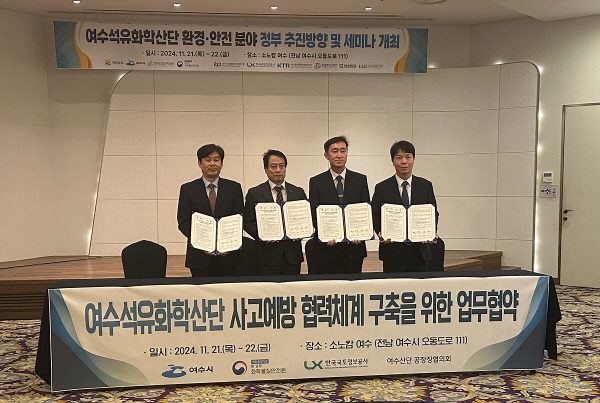 (전남=NSP통신) 서순곤 기자 = 여수시는 환경부 소속 화학물질안전원, 한국국토정보공사, 여수산단공장장협의회와 지난 21일 여수산단 내 지상 및 지하 사외배관 정보를 공유하고 석유화학사고 예방 협력체계를 강화하기 위한 업무협약을 체결했다.