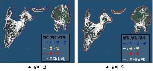 시는 남면, 화정면, 삼산면 등 섬 지역 법정구역(시군구, 읍면, 동리) 경계가 부동산종합공부시스템과 불일치해 도면의 필지별 경계 정보와 위성영상 및 법정구역 경계를 활용하여 오류자료를 정비했다고 밝혔다.