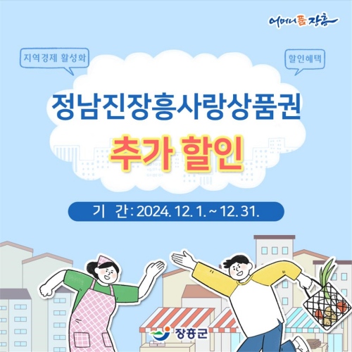 이번 추가 할인은 지난 9월 집중호우로 장흥읍, 용산면이 특별재난지역으로 지정됨에 따라 행정안전부 재난 대응 예산을 지원받아 피해를 본 소상공인과 지역 주민 지원 및 지역경제 활성화를 위해 진행된다.