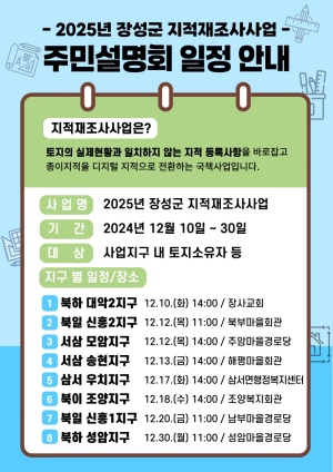 (전남=NSP통신) 김용재 기자 = 장성군이 지난 10일부터 ‘2025년 지적재조사사업 주민설명회’를 시작했다.
