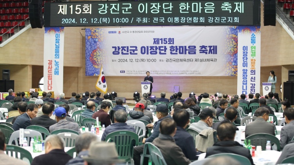 (전남=NSP통신) 김용재 기자 = 강진군 이장단이 지난 12일 강진국민체육센터 제1실내체육관에서 읍면 이장과 기관사회단체장 등 400여 명이 참석한 가운데 ‘2024년 강진군 이장단 한마음 축제’를 성황리에 마무리했다.