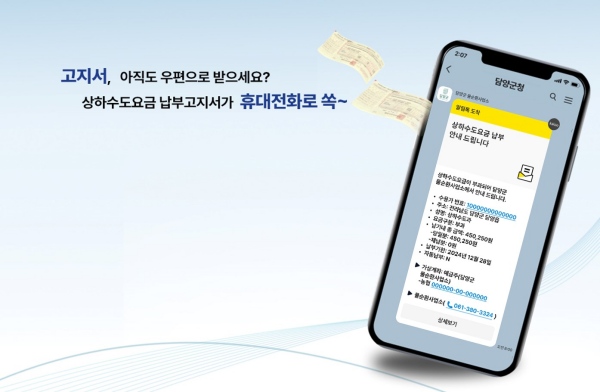 (전남=NSP통신) 김용재 기자 = 담양군 물순환사업소는 정보통신기술(ICT) 기반 전자수도 요금 고지서 서비스인 ‘과세 알림톡 서비스’를 확대 운영한다.