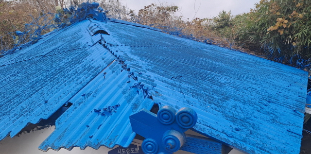 석면 성분 함유 재질로 알려진 슬레이트 지붕에 빠진 상태로, 남아있는 지붕과 측면에 파란색 색채를 덧칠해 흉물스러움을 더욱 부각시켰다는 눈총이다.