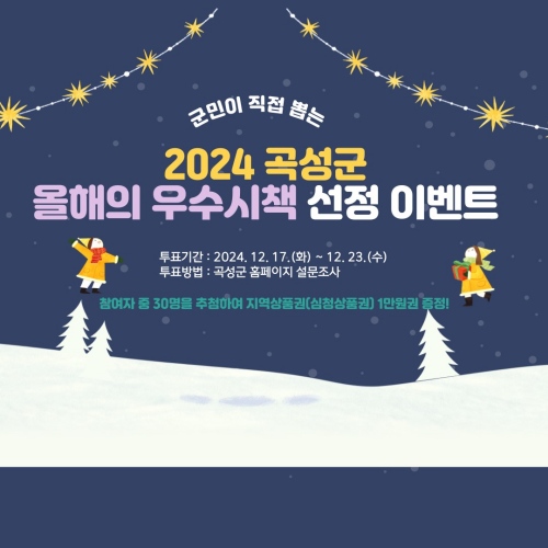 (전남=NSP통신) 김용재 기자 = 곡성군(군수 조상래)은 2024년 올 한 해 동안 추진한 다양한 정책 중 군정 발전과 군민 복리 증진에 기여한 올해의 우수시책을 주민들이 직접 선정한다고 18일 전했다.