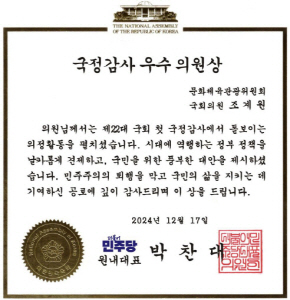 (전남=NSP통신) 서순곤 기자 = 더불어민주당 원내부대표 조계원 국회의원(여수시을)이 당에서 선정한 제22대 국회 첫 국정감사에서 돋보이는 의정활동으로 ‘국정감사 우수의원’에 선정됐다.