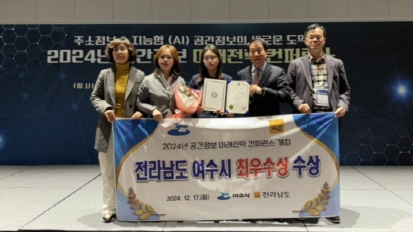 (전남=NSP통신) 서순곤 기자 = 여수시가 지난 17일 해남군에서 열린 2024년 공간정보 미래전략 콘퍼런스에서 ‘섬 지역 드론 실증도시 활용 사물주소 부여’를 주제로 최우수상을 수상했다고 밝혔다.