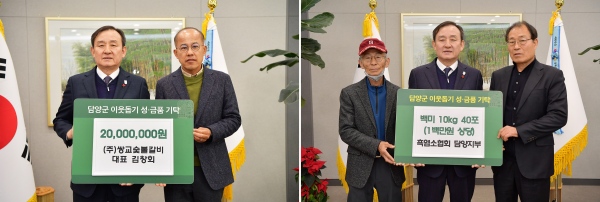 (전남=NSP통신) 김용재 기자 = 연말연시를 맞아 담양군의 어려운 이웃을 위해 사용해 달라며 각계각층에서 현금 및 쌀을 기탁하며 지역사회를 훈훈하게 하고 있다.