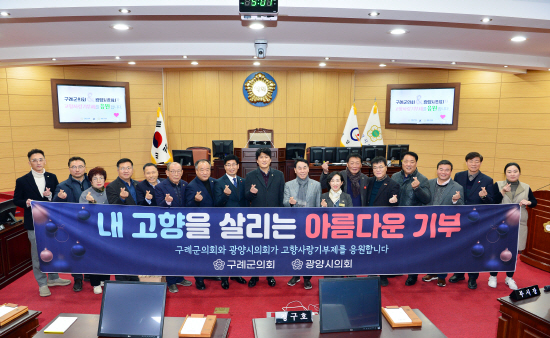 (전남=NSP통신) 김성철 기자 = 광양시의회(의장 최대원)와 구례군의회(의장 장길선)는 지난 23일 광양시의회에서 고향사랑기부금을 서로에게 기부하는 뜻깊은 행사를 가졌다.