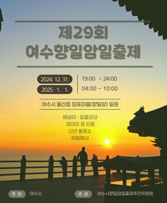 정기명 여수시장은 “남해안을 대표하는 일출·일몰 명당 여수에서 한 해를 마무리하고 을사년 새해의 좋은 기운을 듬뿍 받아 가시길 바란다”며 “시민과 관람객 안전을 최우선에 두고 안전한 일출제 운영에 총력을 다하겠다”고 말했다.