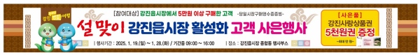 (전남=NSP통신) 김용재 기자 = 강진군이 설 연휴를 맞아 강진읍시장 활성화를 위한 고객 유치 행사를 오는 19일부터 28일까지 총 10일 동안 진행한다.