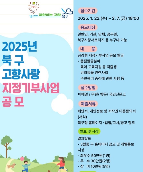이번 공모에는 주민, 기관․단체, 공무원, 북구사랑서포터즈 등 누구나 참여할 수 있으며 저출생, 반려동물, 청년, 일자리, 환경, 문화예술, 관광, 재난 분야에 중점을 두고 최대 2개의 체감도 높은 사업을 발굴할 계획이다.