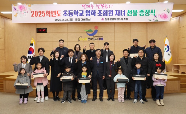 (전남=NSP통신) 김용재 기자 = 장흥군과 장흥군공무원노동조합은 초등학교에 입학 예정인 자녀를 둔 조합원 10명에게 문화상품권과 학습꾸러미 선물세트를 전달했다.