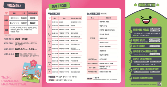 제24회 광양매화축제는 지역민과 관광객이 상생하고 지속가능한 대한민국 문화관광 축제로 도약하기 위해 지난해에 이어 입장을 유료화하고 차 없는 쾌적한 축제장을 실현할 방침이다.