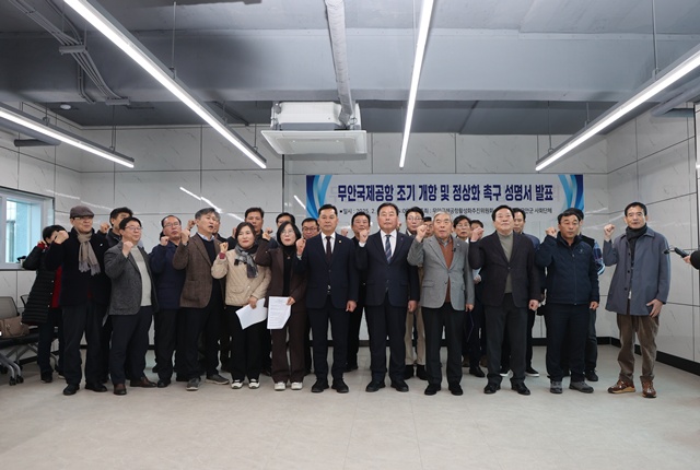 이날 성명서 발표에는 김산 무안군수, 이호성 무안군의회 의장, 무안국제공항활성화추진위원회 위원, 무안군 사회단체 등 약 30명이 참석했다.