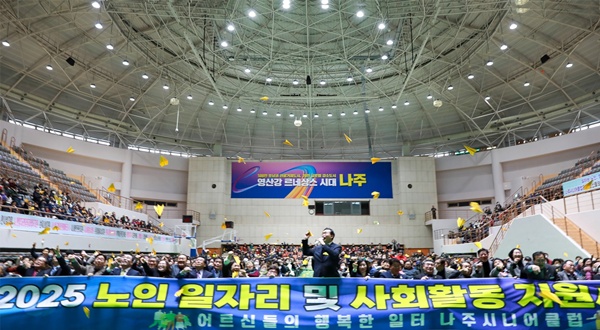 나주시(시장 윤병태)는 지난 25일 나주스포츠파크 다목적체육관에서 일자리 참여자 1500여 명이 참석한 가운데 ‘2025년 노인일자리 사업 발대식’을 했다.