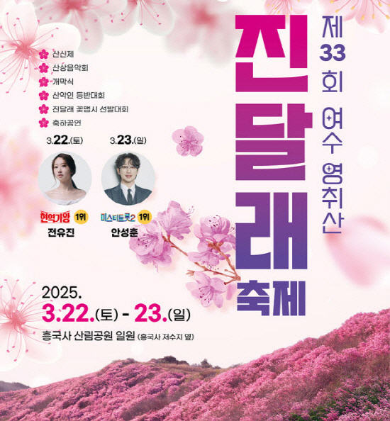 (전남=NSP통신) 서순곤 기자 = 전국 3대 진달래 군락지로 알려진 영취산과 흥국사 산림공원 주 무대 일원에서 오는 22일부터 23일까지 ‘제33회 여수영취산진달래축제’가 개최된다.