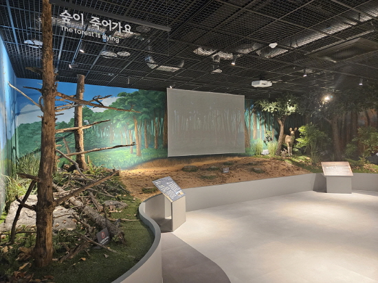 △제1전시실은 ‘숲은 사라져요’라는 주제로 숲의 공익적 기능을 소개하고 기후변화로 인해 사라져가는 동·식물 등 산림 훼손 문제를 영상을 통해 조명하며 멸종위기종 보호 메시지를 전하기 위해 멸종위기종 네임카드를 제공한다. 또한, 출구 앞에는 백운산길을 달리며 산림을 정화하는 자전거 타기 체험도 마련돼있다.