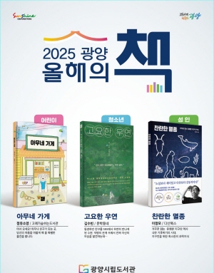 (전남=NSP통신) 김성철 기자 = 광양시가 지난 5일 2025 올해의 책으로 ▲어린이 부문에‘아무네 가게’(정유소영, 고래가숨쉬는도서관) ▲청소년 부문에 ‘고요한 우연’(김수빈, 문학동네) ▲성인 부문에‘찬란한 멸종’(이정모, 다산북스) 총 3권을 선정했다고 밝혔다.