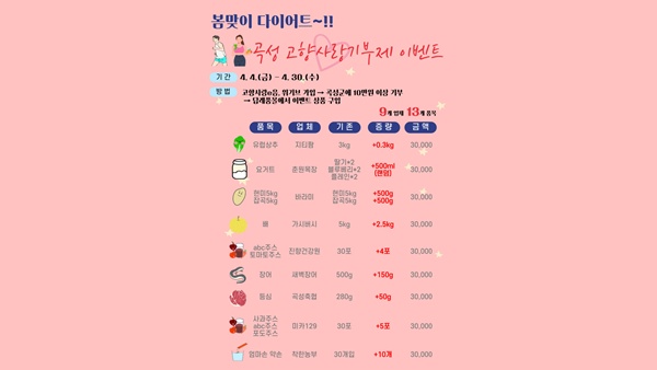 (전남=NSP통신) 김용재 기자 = 곡성군(군수 조상래)이 오는 4일부터 30일까지 고향사랑기부제 ‘봄맞이 다이어트 답례품 증량 이벤트’를 진행한다.