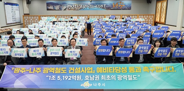 (전남=NSP통신) 김용재 기자 = 나주시가 광주-나주 광역철도사업 예비타당성 조사 통과를 바라는 지역민들의 염원을 하나로 모아 결의를 다지고 있다.