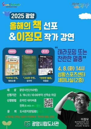 (전남=NSP통신) 김성철 기자 = 광양시가 오는 4월 8일 오후 2시 성황스포츠센터 세미나실(2층)에서 ‘2025 광양시 올해의 책 선포 및 작가 초청 강연’을 개최한다.
