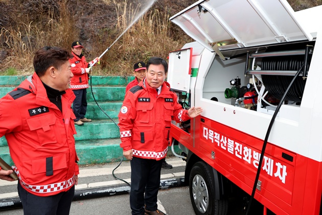 김산 군수는 추가 확보한 산불진화차량 2대를 점검하며, “산불은 예방과 초동 대응이 핵심으로, 장비와 인력 배치에 한 치의 소홀함도 있어선 안 된다”고 강조했다
