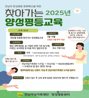 양성평등 교육 신청은 4월부터 시작되며 전남여성가족재단 누리집을 통해 가능하다.