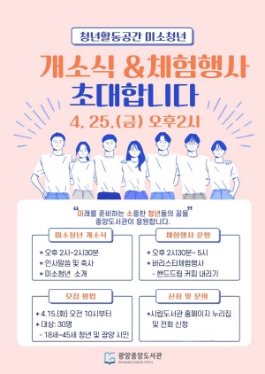 (전남=NSP통신) 김성철 기자 = 광양시는 오는 4월 25일 오후 2시 광양중앙도서관(본관 3층)에서 청년들의 활동 공간 ‘미소청년’ 개소식이 개최된다고 밝혔다.