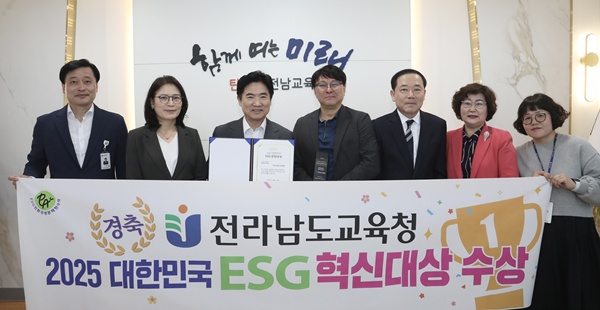 (전남=NSP통신) 김용재 기자 = 전남도교육청이 최근 서울 대한상공회의소에서 열린 ‘2025 대한민국 ESG경제대상’ 시상식에서 공공기관 부문 ‘ESG 혁신 대상’을 수상했다.