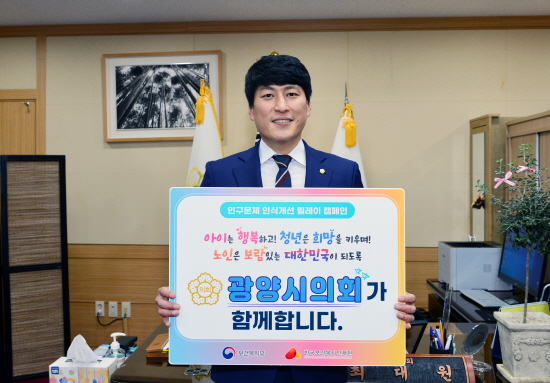 (전남=NSP통신) 김성철 기자 = 광양시의회는 지난 22일 최대원 의장이 인구감소와 고령화 문제에 대한 사회적 인식 제고를 위해 보건복지부와 한국보건복지인재원이 주관하는‘인구문제 인식개선을 위한 릴레이 캠페인’에 동참했다고 밝혔다.