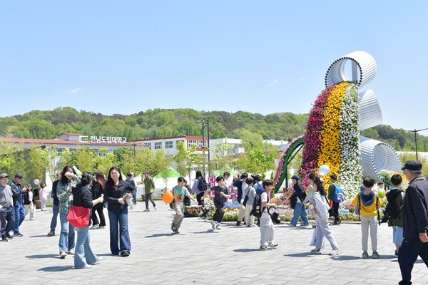 죽녹원 관광정보센터 앞 광장에는 메인 조형물인 '꽃탑'이 설치돼 관람객들의 이목을 끌었으며, 잔디밭에서는 어린이들이 그림을 그리고 부모들이 함께 시간을 보내는 평화로운 모습이 연출됐다.