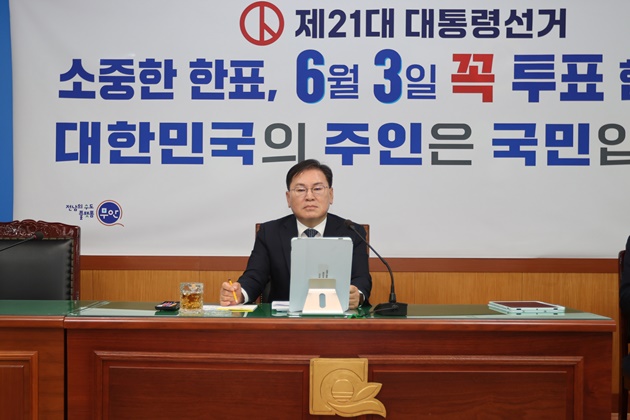 정현구 무안부군수는 지난 13일 열린 현안회의에서 선거 준비 상황을 점검하고 “6월 3일까지 공정하고 깨끗한 선거 관리를 통해 군민 모두가 소중한 한 표를 행사할 수 있도록 각 부서가 적극적으로 투표 참여를 독려해 달라”고 당부했다.