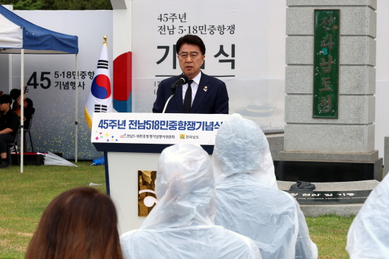 (전남=NSP통신) 김성철 기자 = 김태균 전라남도의회 의장은 전남도청에서 개최된 ‘전남 5·18민주화운동 45주년’ 기념식에 참석해 “5·18 진상규명과 민주화운동 관련자 지원을 위한 의정활동에 더욱 힘쓰겠다”고 밝혔다.