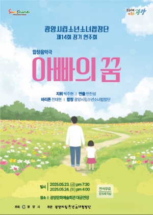 (전남=NSP통신) 김성철 기자 = 광양시는 광양시립소년소녀합창단(지휘 박주현)이 오는 5월 23일 오후 7시 30분과 24일 오후 4시, 양일간 광양문화예술회관 대공연장에서 제14회 정기연주회 ‘아빠의 꿈’을 선보인다고 밝혔다.