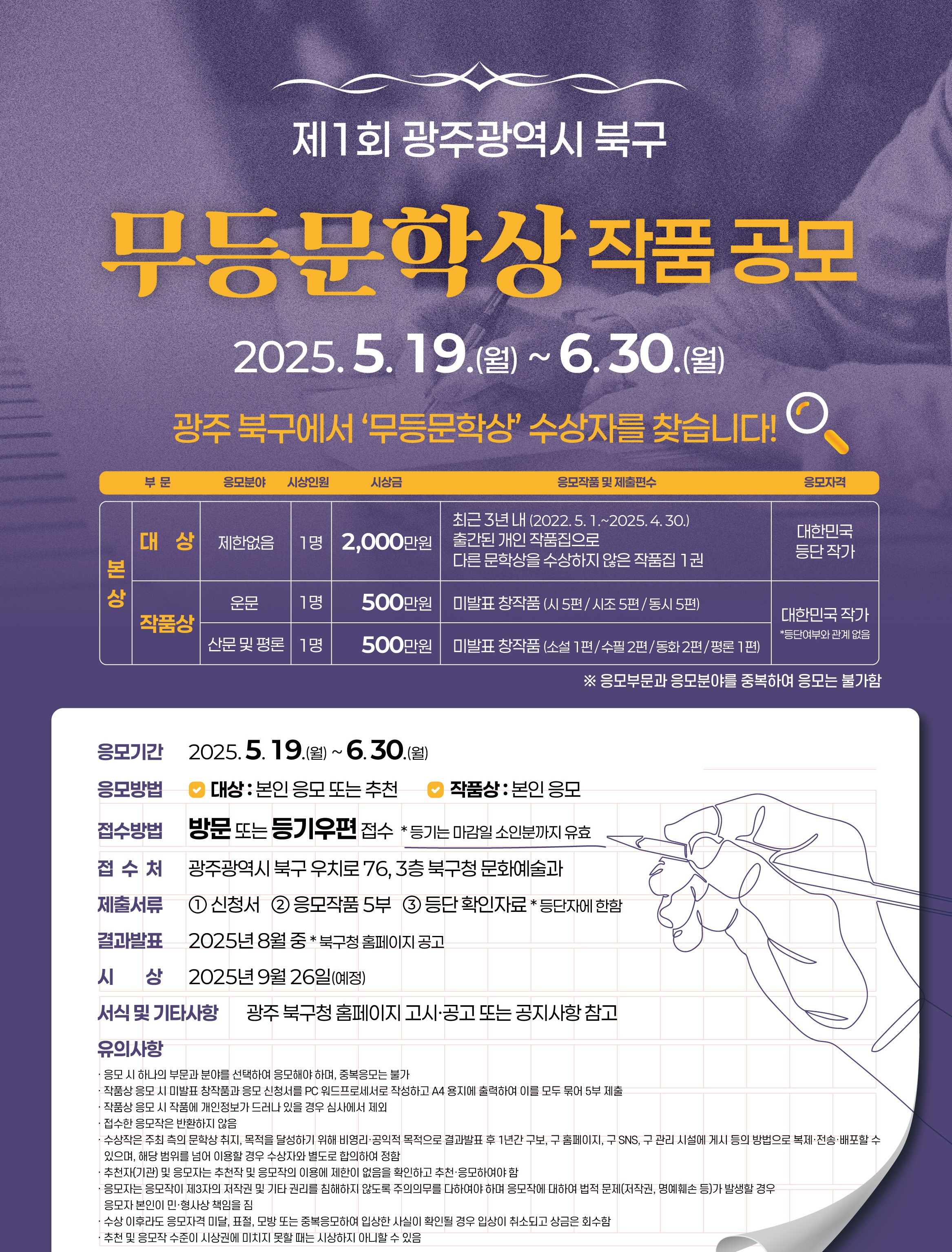 접수가 마무리되면 오는 7~8월 중 전문가로 구성된 심사위원의 심사를 거쳐 대상 1명과 작품상 2명(운문 1명, 산문 및 평론 1명)을 선정할 예정이며, 최종 결과는 오느 ㄴ8월 중 북구청 누리집을 통해 발표할 예정이다.