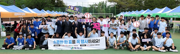 (전남=NSP통신) 김용재 기자 = 강진군 관계자들이 제21대 대통령선거를 앞두고 최근 열린 전남영농학생축제에 참석한 청소년들과 함께 투표 참여 독려 홍보 캠페인을 벌이며 군민의 투표 참여를 독려했다.