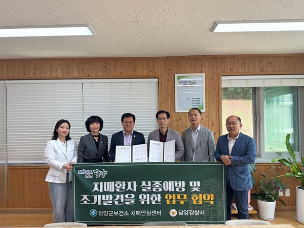 담양군은 지난 27일 보건소 2층 소장실에서 담양경찰서(수사과장 안경수)와 함께 ‘치매환자 실종 예방 및 조기 발견을 위한 업무협약’을 체결했다.