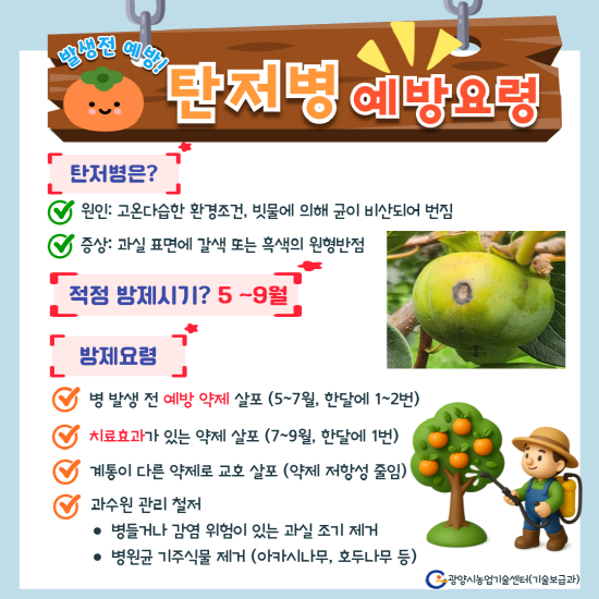 탄저병은 감의 잎, 줄기, 열매에 전반적으로 발생하는 병해로, 전년도 수확 후 방치되거나 관리가 미흡한 과원에서 균이 잠복해 있다가 고온다습한 생육환경이 조성되면 발병한다. 감염이 시작되면 포자가 인근 과원으로 퍼지거나 장마철 빗물을 통해 급속히 확산되는 양상을 보인다.