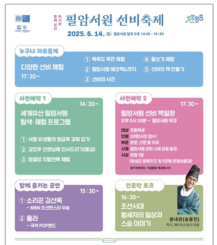 국가유산청과 장성군이 공동 주최하고 광주문화나루가 주관하는 세계유산 활용 공모사업 ‘하서와 함께 걷다 : 필암서원 선비축제’가 오는 14일 필암서원 일원에서 개최된다. 앞선 지난 5월에 이은 두 번째 행사다.