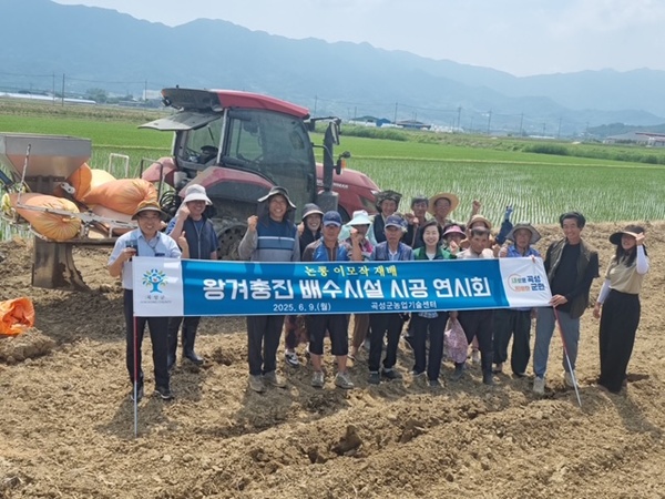 (전남=NSP통신) 김용재 기자 = 곡성군(군수 조상래)이 관내 시범사업 현장에서 논 무굴착 왕겨충진형 배수기술의 시공 과정을 농업인들에게 시연하고 기술 설명회를 개최해 관심을 끌었다.